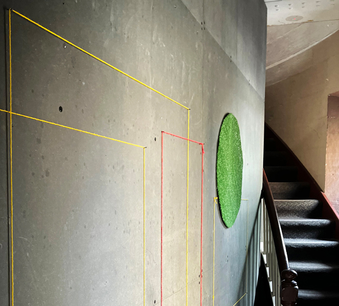 This drawing is paired with another work in the Library’s upstairs FRONTSPACE that means that when someone sits in one of the lounge chairs there, they have the opportunity to see that the two shaped lawns in front of them are more or less repeated in the two side tables covered in ‘grass’ beside them. Again, anyone can see this ‘repetition’ is a stretch – the actual lawns are much bigger, they have a different shape to the side tables and so on. It is only the repetition of their location and of their own doubled grassiness that is used to make their likeness in FRONTSPACE—is that enough?